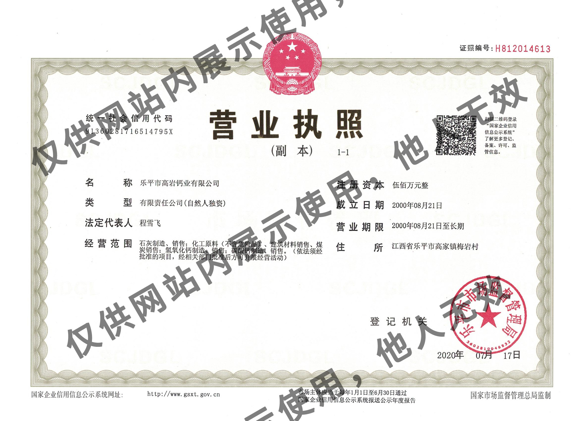 公司董事長程金才同時還擔任樂平市高德采石場的股東,擁有江西程航貿易有限公司,樂平市紅巖幸福石灰廠。為做大做強企業,本公司確立“誠信是企業的未來,質量是企業的生命”原則,堅持以人為本,誠信經營,質量至上,努力將企業打造成全國行業內具有競爭力的高產量,多元化的綜合性鈣產品生產企業。